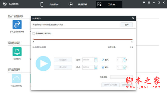 点击“工具箱”===“铃声制作”==点击“选择”导入音乐===移动滑块设置时间和截取的音乐==然后点击保存到电话或者导入设备